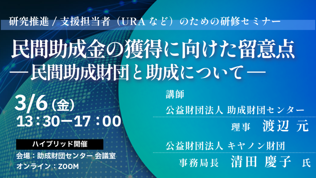 皆様の今後の業務はもとより、助成を希望する研究者や教員の方々にとっても大いに参考となる内容です。 ぜひ、ご参加ください。