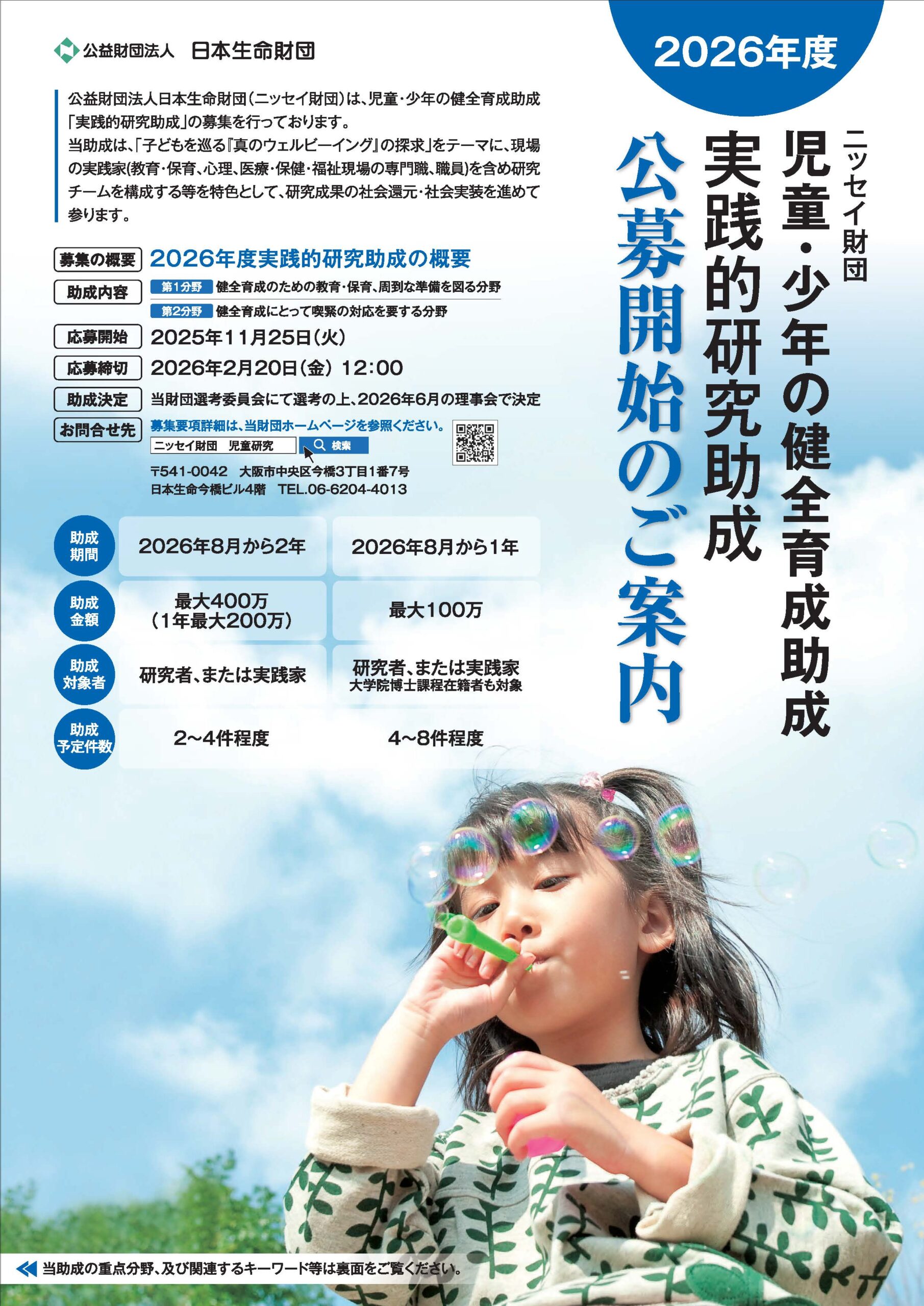 【概要】 児童・少年の健全育成助成「実践的研究助成」は、研究者と実践家が協働して、現場の実践をベースにして実践に役立つ成果をあげるための研究への助成を実施。 特に、以下の重点分野に対する課題を明確にした研究への助成を実施 ■第1分野:健全育成のための教育・保育、周到な準備を図る分野 (教育・保育、予防的対処等を図る分野) ■第2分野:健全育成にとって喫緊の対応を要する分野 (療育的対処等を要する分野) ※分野毎に関連するキーワード・キーフレーズはHPに掲載 【対象】 ・研究者または実践家(研究者であり実践家である者を含む) ・複数名の研究組織で研究者と実践家の双方が参画 上記2点を満たす研究に助成 https://nihonseimei-zaidan.or.jp/jidou2/02.html 【助成の種類】 ・2年助成(1件最大400万円) ・1年助成(1件最大100万円) ※2年助成と1年助成の重複申請は不可